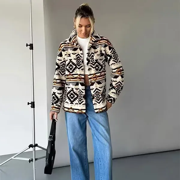 Stay warm and trendy in this Aztec Pattern Button-Down Fleece Jacket. It features a cool geometric print that looks unique and stylish. The soft fleece fabric keeps you cozy in cold weather. It has buttons and pockets for extra convenience. You can use this product as a comfortable coat for daily wear or a stylish layer for travel. It is a great choice for occasions like camping trips, outdoor walks, or casual hangouts.