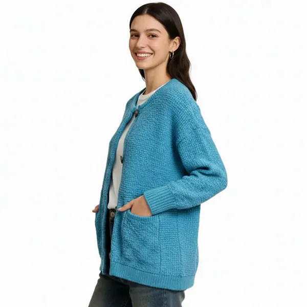 Add a layer of warmth with this Cozy Blue Button-Up Cardigan. It is made from soft knit fabric that feels gentle and warm. The classic button-up design makes it easy to wear over shirts or dresses. The relaxed fit keeps you comfortable all day long. You can use this product as a light jacket for the office or a cozy top for home. It is a great choice for occasions like casual Fridays, coffee dates, or cool evenings.