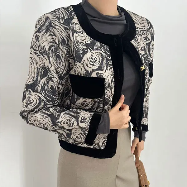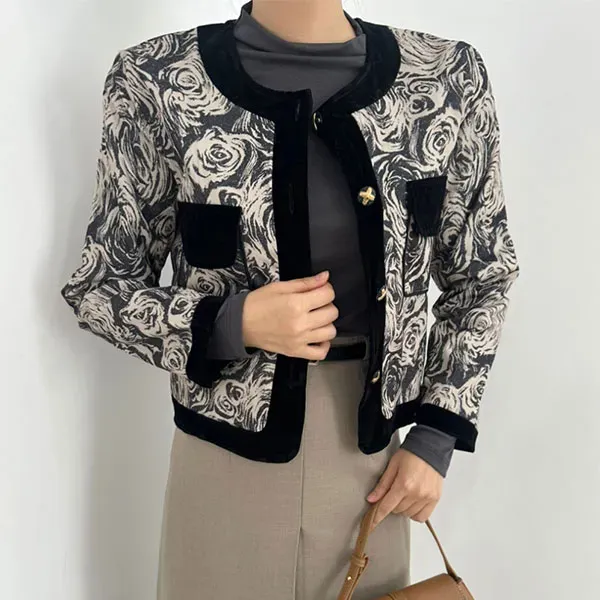 Add a fancy touch to your outfit with this Floral Print Cropped Jacket with Velvet Trim. It features a beautiful flower pattern that looks very elegant. The velvet edges give it a luxurious and unique style. The cropped length is perfect for wearing over dresses or high-waist pants. You can use this product as a stylish layer for a dinner date or a chic jacket for a party. It is a great choice for occasions like evening events, holiday celebrations, or casual gatherings.