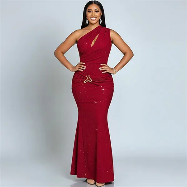 Shine bright like a star in this Glitter One-Shoulder Mermaid Maxi Dress. It is covered in sparkles that catch the light beautifully. The one-shoulder style and cut-out detail make it very sexy and modern. The mermaid shape hugs your curves and flares at the bottom. You can use this product as a show-stopping dress for a wedding or a gala. It is a great choice for occasions like red carpet events, prom nights, or fancy parties.