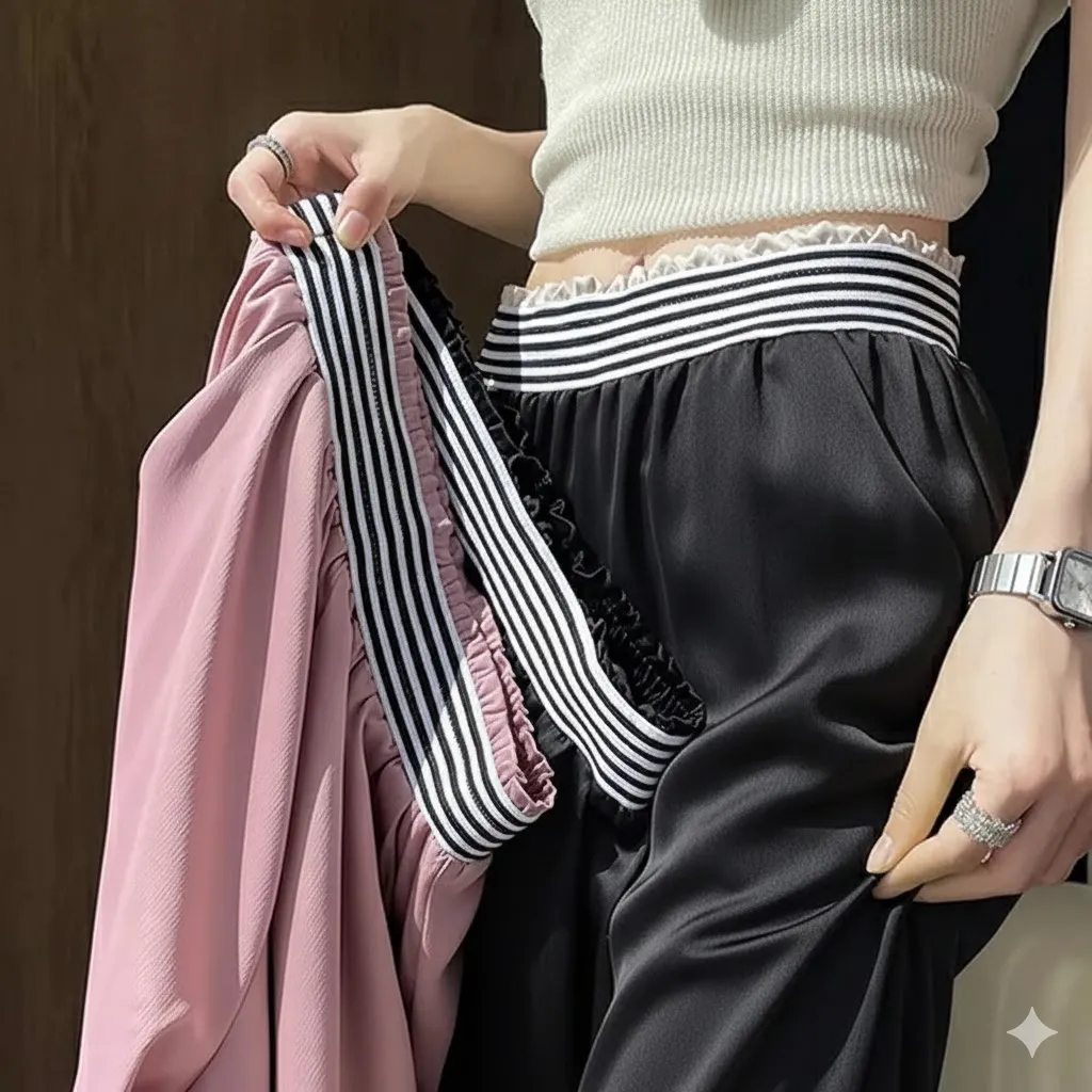Material: Â Shiny, lightweight, and cooling satin-texture fabric.Waist: Â High-waisted with a distinctive striped elastic band.Fit: Â Relaxed wide-leg cut that elongates the legs.Comfort: Â Breathable and loose, ideal for casual wear or lounging.Colors: Â Available in Black,ÂSize Guide :