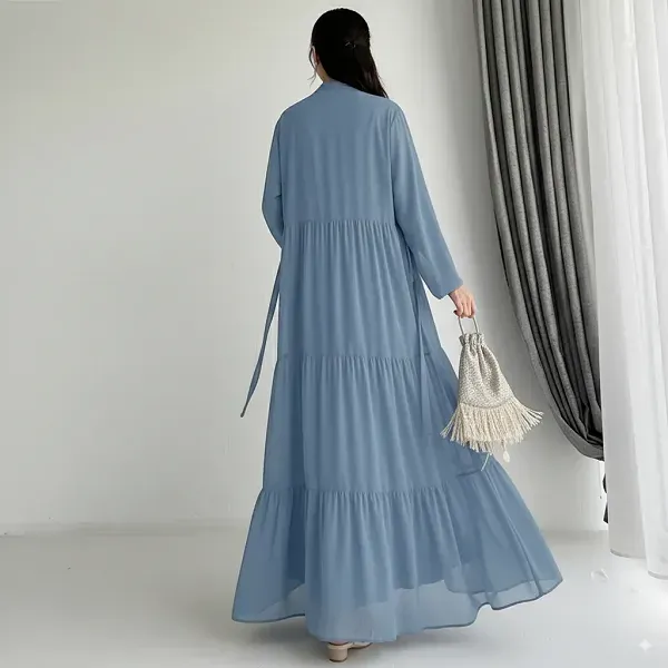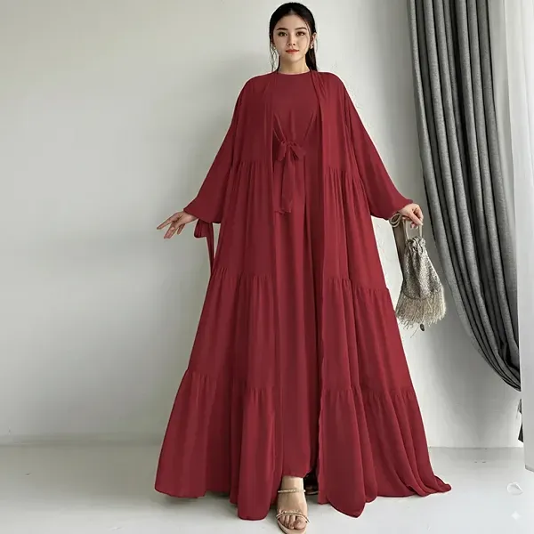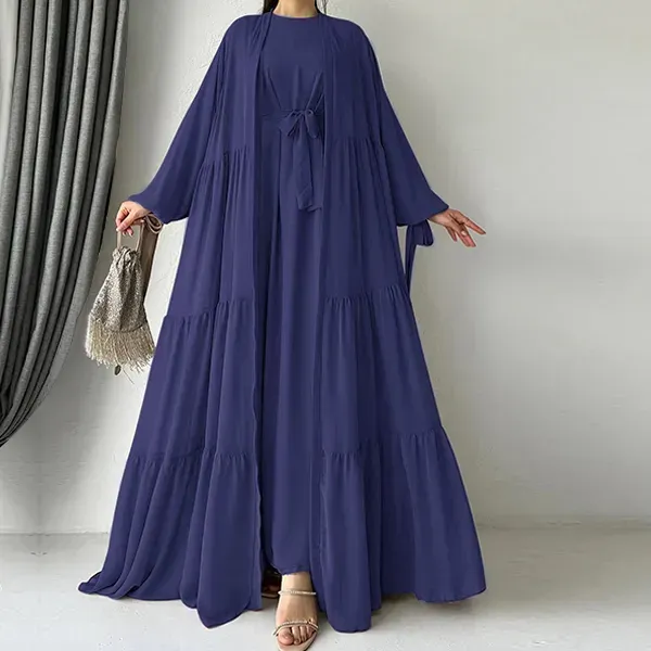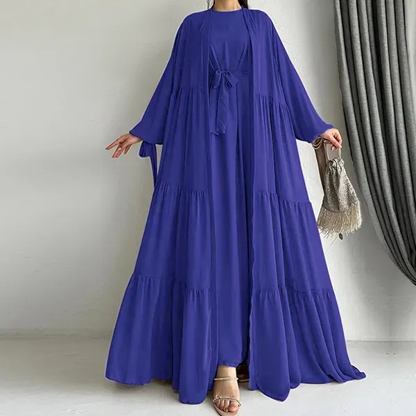 Look elegant and modest in this Long Sleeve Ruffle Hem Abaya Dress with Cardigan. It comes as a beautiful set with a long inner dress and a matching outer cardigan. The ruffle hem adds a stylish and feminine touch. The fabric is soft and flows gracefully when you move. You can use this product as a perfect outfit for Eid celebrations or a classy look for family visits. It is a great choice for occasions like Ramadan gatherings, weddings, or formal dinners.