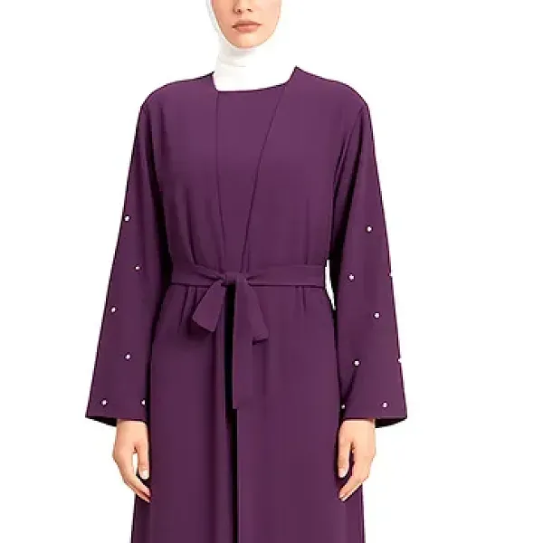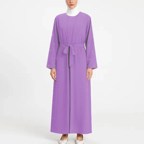 Look elegant and modest in this Pearl Embellished Sleeve Two-Piece Abaya. It features beautiful pearls on the sleeves that add a touch of luxury. The two-piece design includes a comfortable inner dress and a matching outer layer. The belt at the waist helps you adjust the fit perfectly. You can use this product as a stunning outfit for Eid or a classy look for a wedding. It is a great choice for occasions like family gatherings, formal dinners, or religious celebrations.