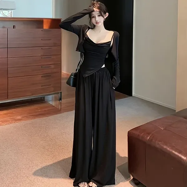 Three Piece Draped Top Cardigan and Wide Leg Pants Set