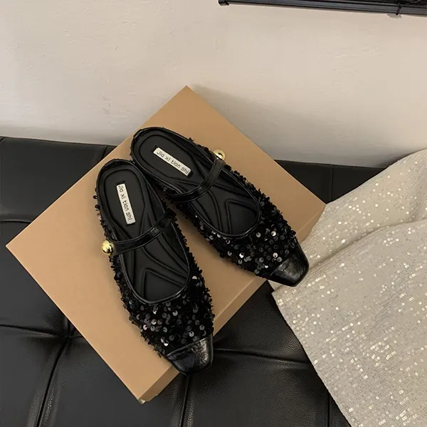 Women’s Korean Style Half Slippers, Low Heels with Sequins